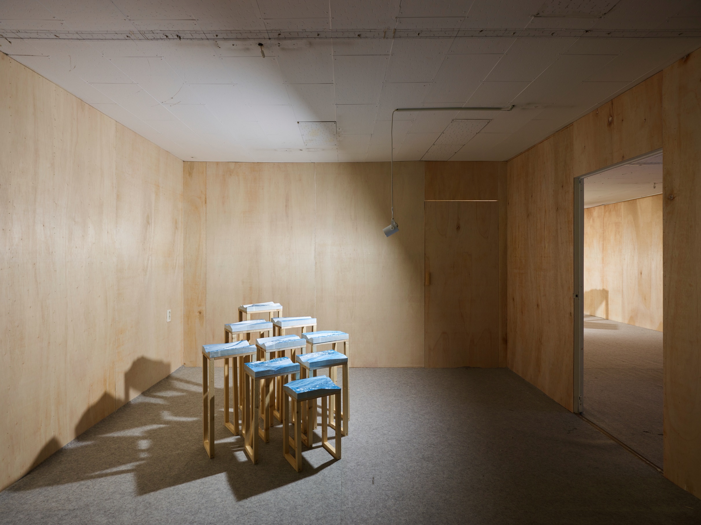 최원교는 ‘사진’이라는 매체를 납작한 기록으로 두지 않는다. 그녀는 디지털 카메라로 포착한 산업 현장의 세밀한 질감을 확대·분절·조각해 공간 속으로 끌어들인다. 그 결과물은 때로는 공장 외벽의 녹슨 파란 페인트가 리드미컬한 추상으로, 때로는 반복되는 기계 동작을 은유하는 폭포수같은 무빙 이미지로 변주된다. 사진을 ‘손으로 조각한’ 입체 오브제로 변환시키는 과정은 디지털 공정이 낳은 비물질성을 손의 노동으로 되돌리는 것을 뜻한다. 이 과정에서 사진이라는 매체는 디지털 비물질성을 벗고 지역 산업지형의 질감과 사회적 맥락을 담은 조형 오브제 또는 키네틱 설치로 재탄생하는 것이다. 작가는 사진 면 뒤에 숨어 있는 다층적 거리감과 현실과 전시 공간을 겹쳐 놓는 실험적 시각 경험을 선보이며 ‘평행한 깊이’의 의미를 보여주고 있다.